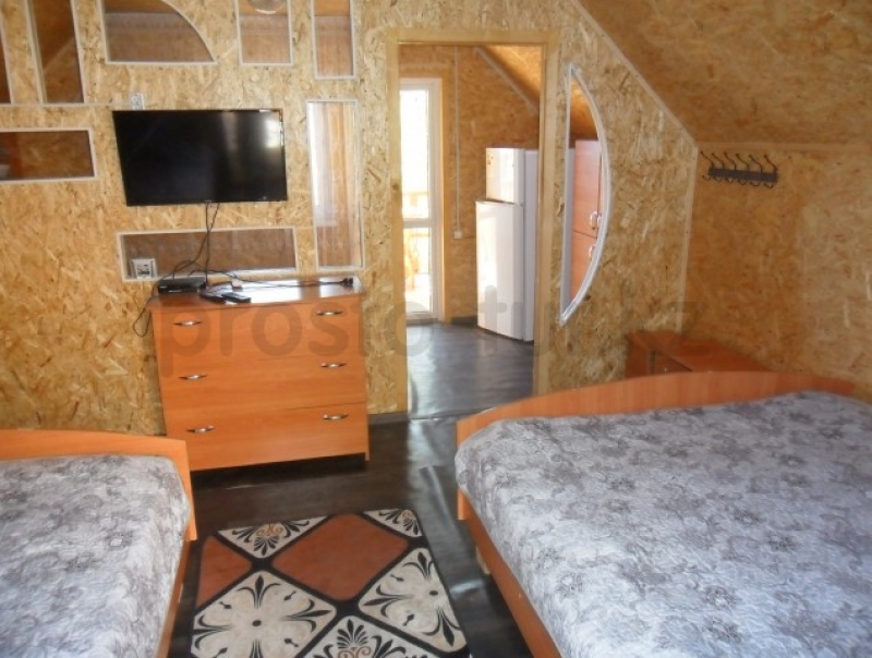 4 _х местный домик (№5): Комната студия расположена на втором этаже с балконом. Имеется туалет, душ, горячая, холодная вода, Кондиционер, холодильник, кухонная плита с духовкой, микроволновка, телевизор ЖК (спутниковое тв), две 2-х спальные кровати.