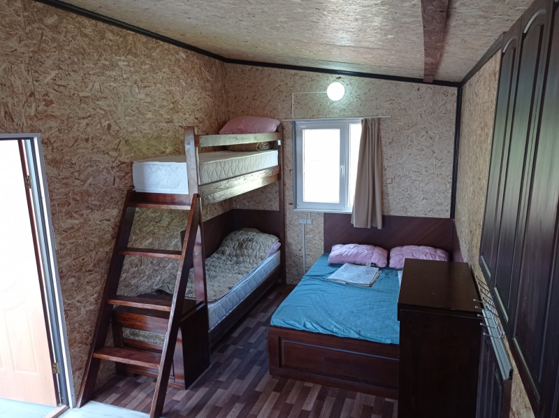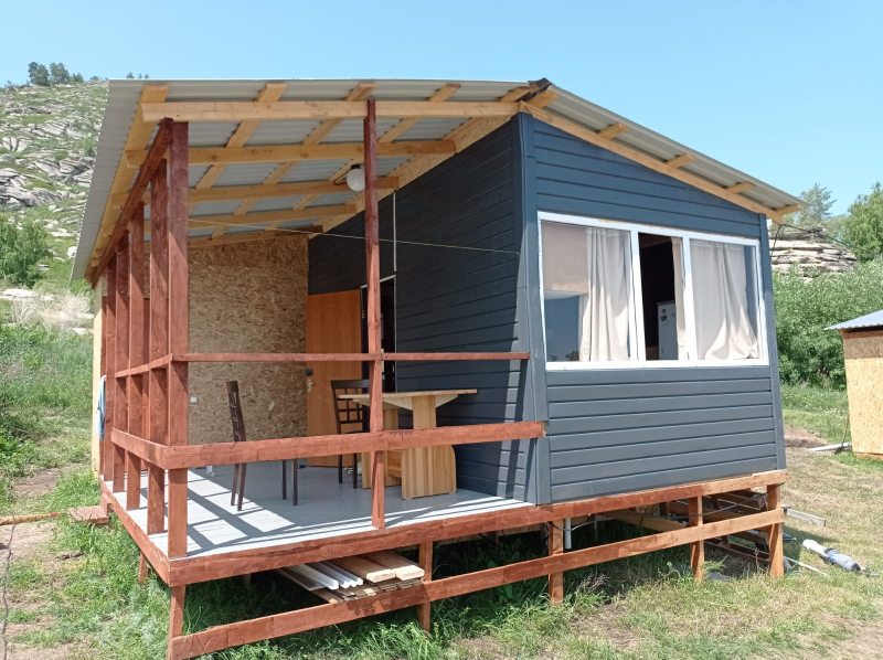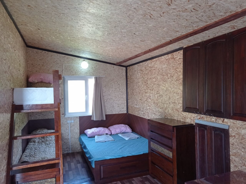 Цены 2026 года. Домик рассчитан на 4 человека. В домике есть две отдельные комнаты и кухня. В одной комнате есть двуспальный диван, в другой две полутора - спальные кровати с ортопедическими матрасами. В доме горячая и холодная вода. Туалет и душ внутри дома. В кухне стол, стулья, посуда, холодильник, плита, чайник. Домик расположен в 45 метрах от пляжа. На территории есть кафе. Домики можно заказать с питанием. Стоимость трех разового питания (завтрак, обед, ужин) с одного человека (в зависимости от возраста) 3800 тенге в сутки взрослые, 3300 за детей до 7 лет. На территории недалеко имеется волейбольная площадка, детская площадка, магазин. Отличная рыбалка, лес, горы, пляж песочный, берега пологие. Отличный отдых для всей семьи.